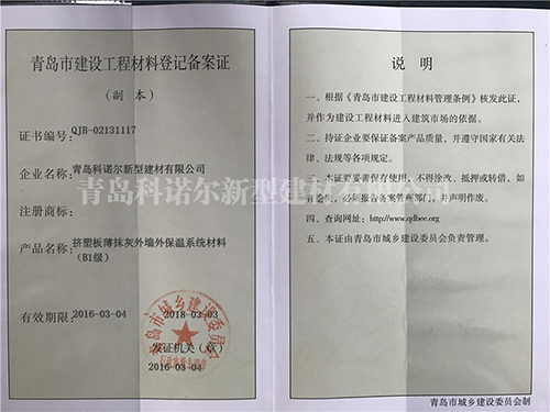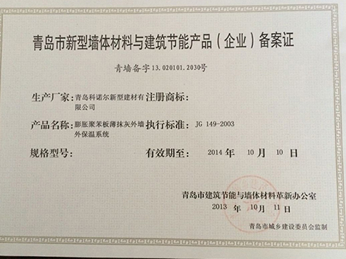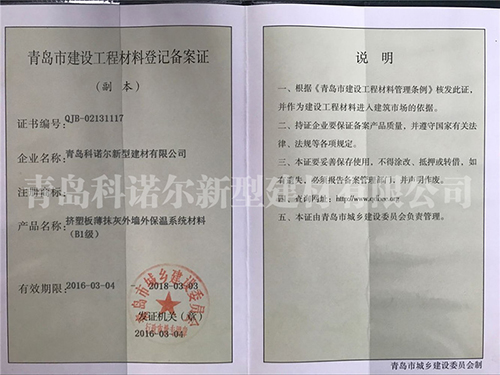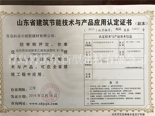 青島科諾爾新型建材有限公司主要產(chǎn)品:擠塑板( 阻燃B1級(jí).B2級(jí)),泡沫板( 阻燃B1級(jí).B2級(jí))及各種造型,聚合物砂漿系列(粘結(jié)砂漿.罩面砂漿.膠粉.瓷磚粘接劑.填縫劑.界面劑),各種新型建材、保溫材料等等,公司產(chǎn)品遍銷(xiāo)全國(guó)各地,受到廣大用戶(hù)的一致好評(píng)。